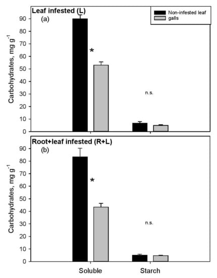 Soluble nonstructural carbohydrates and starch as measured in noninfested leaf portion (black bars) and in nearby galls (grey bars) sampled from leaf (L) (a) and both root and leaf infested (R+L) (b) plants 56 days after inoculation. * denotes significant difference between groups (Student’s t-test); n.s. indicates lack of significant differences.