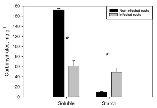 Soluble nonstructural carbohydrates and starch as measured in noninfested (black bars) and infested (grey bars) root tips sampled from both root and leaf infested plants (R+L) 56 days after inoculation. * indicates significant difference between groups (Student’s t-test).
