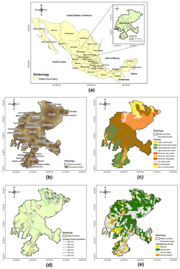 Maps of the state of Zacatecas: (a) Geographical location in Mexico; (b) Municipal division; (c) Types of climate; (d) Annual isohyets; (e) Potential soil use. Source: Prepared by the authors based on [68].