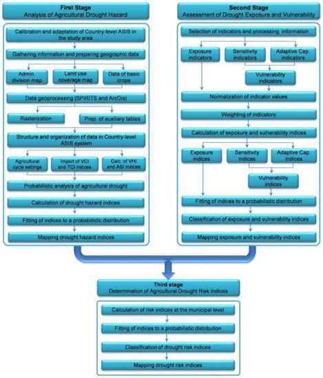 The proposed method was conducted in 3 stages (Figure 3). First, we analyzed agricultural drought hazard at the municipal level using the Agricultural Stress Index System (ASIS), specifically, its country version (Country-Level ASIS), which is based on satellite information and was developed by the UN’s Food and Agriculture Organization (FAO), which supports countries in the monitoring and early warning of drought affecting agriculture [69]. Subsequently, we assessed exposure and vulnerability to drought based on a set of socioeconomic and environmental indicators obtained from databases operated by recognized Mexican institutions and combined these indicators using an analytic procedure to generate exposure and vulnerability indices [20,50]. Finally, we determined agricultural drought risk indices utilizing a weighted addition of hazard, exposure, and vulnerability indices. The following sections describe these phases in detail.