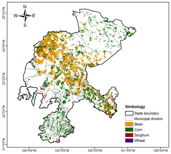 The land use/cover map (crop mask) is considered the fundamental input for monitoring agricultural drought because it pinpoints the location of the basic crops being monitored. The crops considered by the present study were rainfed beans and grains (maize, wheat, and sorghum); according to the FAO, these crops are important for food security to guarantee an elemental diet. The crop mask for the study area was provided in vector format (shapefile) by SIAP [83]; it was converted to a raster format (similar to the administrative division map) to create the map shown in Figure 5.