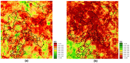 The previously specified calibration protocol [82] indicates that the installation and processing requirements of the Country-Level ASIS include a computer with an ideal hard disk capacity of 10 TB dedicated exclusively to the agricultural drought monitoring system. The required computer was acquired via an investment expense from the National Council for Science and Technology (CONACYT), and the software was provided free of charge by FAO. The system was installed and calibrated using advice from FAO experts, who provided technical support during the process as well as manuals on how to use the tool. The 35-year historical record (1984–2019) was downloaded via FTP (file transfer protocol) from FAO HQ (Rome); the dataset was updated every 10 days via the same connection. The essential vegetation indices to download were the VCI and TCI indices. These indices were intended to calculate the VHI index, as previously mentioned. Figure 6 presents an example image, including the VCI and TCI indices for the study area.