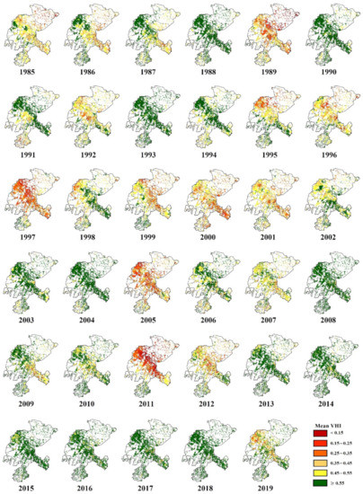The VHI is a combination of the Vegetation Condition Index (VCI) and the Temperature Condition Index (TCI). The VCI is in turn derived from the Normalized Vegetation Difference Index (NDVI) [73]. The latter is an indirect measure of primary production as a function of its relationship with photosynthetically active radiation [74]. The VCI locates the NDVI between the maximum and minimum of the historical series of satellite information and is expressed as