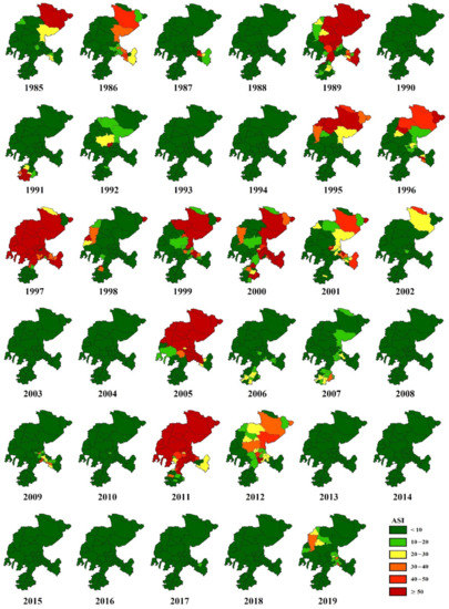where ASI is the percentage of cultivated area affected by drought in each municipality (including all selected crops) for a specific year i and n is the total number of recorded years.