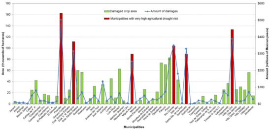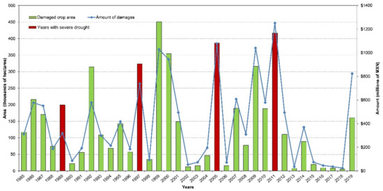 Given that the agricultural sector is essential for Mexico’s food security, the impact of drought on agricultural production has received increasing attention in recent years [17]; moreover, agriculture is an essential economic activity in the country’s rural areas, home to 22% of the national population [18]. Seventy-nine percent of cultivated surface area in the state’s production units is rainfed (25.6 million hectares), while the remaining 21% is irrigated (6.8 million hectares) [19]. In general, the first economic sector affected by drought is rainfed agriculture because it depends entirely on rainwater for production, which makes it highly vulnerable to meteorological drought. This type of agriculture is practiced mostly by low-income farmers, the first among society to feel the effects of drought. They are small producers who, with their work and that of their families, achieve just enough production to support themselves, rarely more than that. In the event of a drought, their plants fail to germinate or wither and die. In any case, they are unable to harvest: the first step into disaster [20].