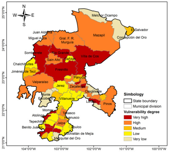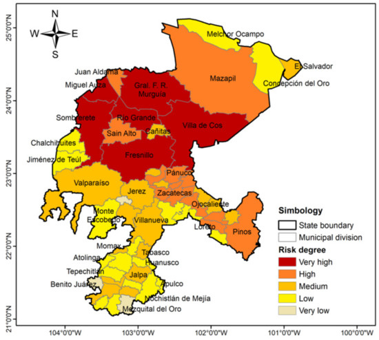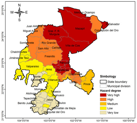 Finally, we developed an agricultural drought hazard map for the state of Zacatecas using the ArcGis® software using the National Geostatistic Framework as a base map [68], which outlines state and municipal divisions.