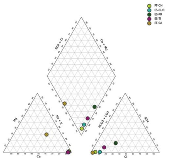 Based on the Piper diagram, thermal waters of the two regions of the Iberian Peninsula were classified chemically (Figure 1), the Piper diagram analysis showed that there are mainly three water groups, two of them in a transient phase (Figure 1). The first group included the water samples ES_BUR, ES_TI and PT_CH, classifying them as bicarbonated sodium waters. In addition, these samples presented high values of sodium (Na) and potassium (K), but also of bicarbonate anions (HCO3−) (Table 1). The second group, the sample ES_PR is located in one of the transition zones, between the bicarbonated sodium waters and the sulfated or chlorinated sodium waters. The classification can be justified when analyzing these results together with Table 1, since the sample ES_PR had the highest values of sulfate anions (SO42) and sulfite (SO32−), compared to the other samples. Regarding the third group, the water sample PT_SA is also located in a transition zone, between the sodium bicarbonated waters and the bicarbonated calcium or magnesian waters. Additionally, the sample PT_SA had the highest values of magnesium (Mg) and calcium (Ca), but also had a high content of sodium (Na) and bicarbonate anions (HCO3−), thus placing it in the transition between the bicarbonated sodic waters and the bicarbonated calcium or magnesian waters.