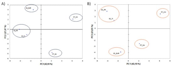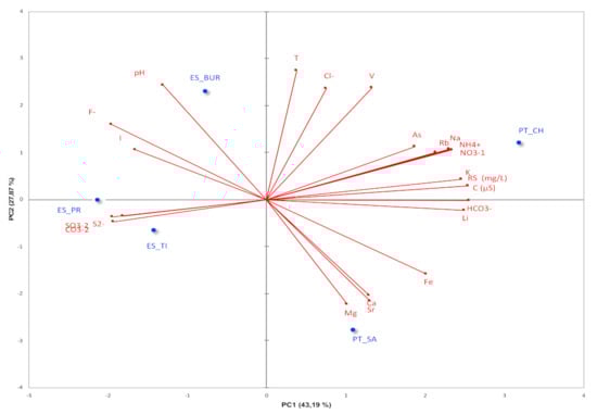 The projection of the first two main components (PC1 and PC2) and the main components (PC1 and PC3) are demonstrated in Figure 2, respectively. Regardless of the PC1 and PC2 components or the PC1 and PC3 components can be observed that the five samples of thermal waters in both projections were always grouped in four groups, although a displacement occurs in the positioning of the waters in the quadrants. Considering this reason and that the PC1 and PC2 components present more than 70% of the variance in comparison to 66.74% for the PC1 and PC3; the thermal waters were clustered into the following groups: (1) ES_BUR, (2) PT_CH, (3) PT_SA and (4) ES_PR and ES_TI.