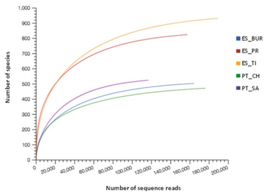 For each analyzed water sample, the rarefaction curve was calculated through the MG-RAST server. These rarefaction curves represent the richness of the different species annotated as a function of the number of reads presented, demonstrated that practically all samples tend to approach an asymptote before 100,000 reads, that is, most species present in the samples have already been discovered (Figure 4). Taking into account that all samples reached a stable plateau, obtaining more than 100,000 reads after the quality control of the MG-RAST server (Table 3) and a larger number of reads would not increase the count of species obtained [21,57]. These results demonstrated a reliable sequencing of the microbiota community and there is still a great diversity of unknown microorganisms.