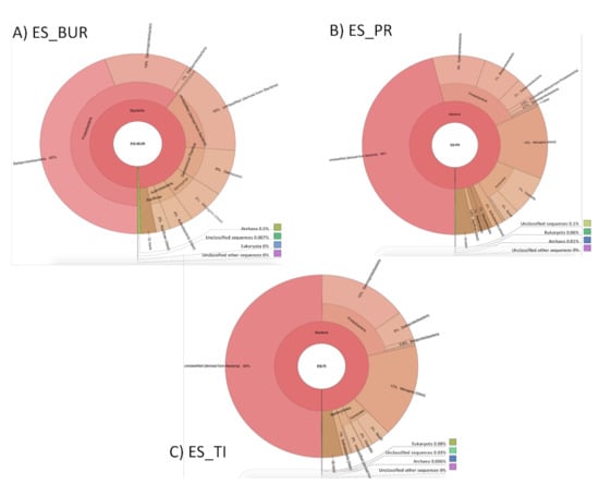 In relation to the Firmicutes phylum in this study, the samples that presented a greater amount of sequences were ES_PR and ES_TI (Figure 5). This phylum has some interesting characteristics for scientific research, in particular by including some genera of aerobic or anaerobic bacteria that produce endospores. These endospores are responsible for conferring resistance to conditions of high temperatures and other environmental stresses [72]. The Firmicutes phylum also presents genera such as Staphylococcus, Enterococcus, Streptococcus, Clostridium, Bacillus and Lactobacillus, being these genera are quite used in biotechnological processes. The appearance of microorganisms of the Firmicutes phylum in thermal waters with temperatures around 50 °C, has been frequently reported worldwide [73,74,75].