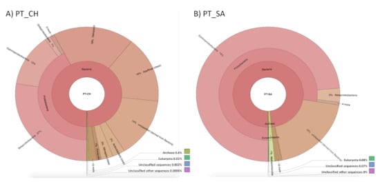 In the water sample PT_CH, the major of sequences were associated to the realm of Bacteria (99.95%), of which 42% belongs to the phylum Proteobacteria (27% Betaproteobacterias, 13% Gammaproteobacterias, 1% Deltaproteobacterias and the remaining 1% is distributed among the other classes, as is the case of Alphaproteobacteria), 18% to the Deinococci class, 16% to the Aquificae class, 14% were not classified and the remaining 10% belong to the minority classes, such as Actinobacteria and Nitrospira classes (Figure 6).
