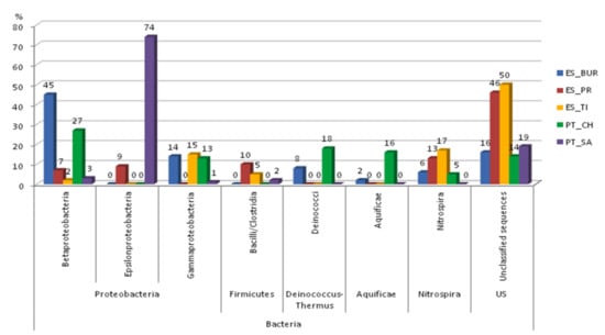 In all water samples of this study, the phylum Proteobacteria (22% to 78%) was the most abundant, following the phylum Deinococcus-Thermus (8% to 18%), Nitrospira (5% to 17%), Aquificae (2% to 16%) and Firmicutes (2% to 10%). In addition, the Proteobacteria phylum was clearly the most representative phyla in the following water samples PT_CH, ES_BUR and PT_SA, compressing the class Betaproteobacteria (ES_BUR and PT_CH), Epsilonproteobacteria (PT_SA and ES_PR) and the class Gammaproteobacteria (ES_BUR, ES_TI and PT_CH). The phyla and classes with a representation ≥10% are shown in Figure 7.