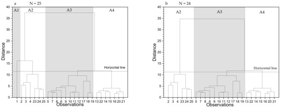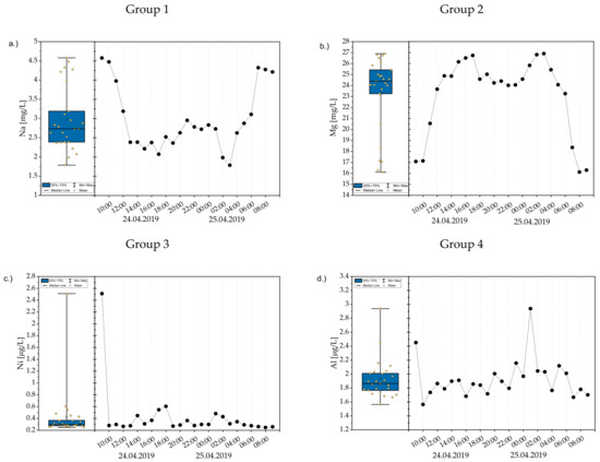 - Group 2 (Figure 5b): lower values in the beginning and at the end and higher in between (i.e., K, Mg, As, Mn, V);