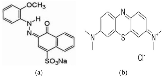 Chemical structures of: (a) Acid Red 4 (b) Methylene Blue.