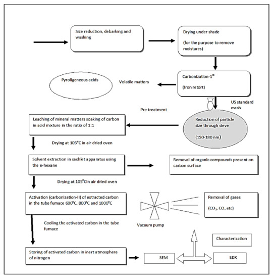 Paulownia tomentosa wood was used as raw material for the preparation of activated carbon. It was collected from Peshawar, Pakistan. A schematic presentation of the experimental setup is given in Figure 2.