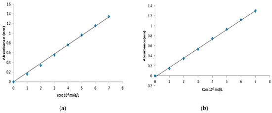 where, qt is the amount of dye adsorbed (mg/g), %R is dye removal efficiency, C0 is the initial dye concentration (mg/L), ct is dye concentration after adsorption, V is the volume of dye solution (mL), while W is the weight of adsorbent (g). The calibration curves of the experimental measurements performed on the dyes are given Figure 3.