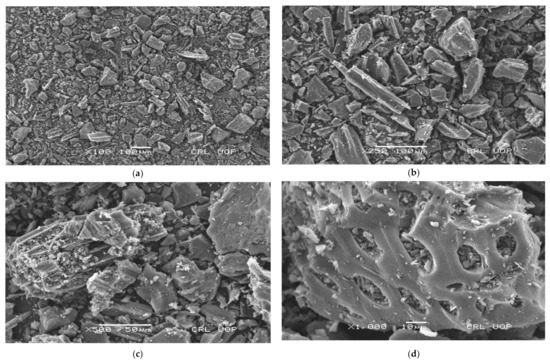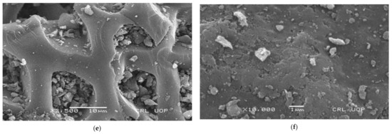 The morphological studies of activated carbon were carried out using scanning electron microscopy (SEM) analysis. The SEM images at different magnifications are shown in Figure 4a–f. The micrographs show the rough surface of the prepared AC. On the surface there are irregular channels present for the adsorption of the dye and other pollutants.