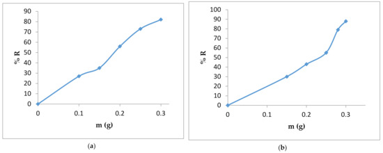 Dosage studies are important, because they determine the removal efficiency of a given adsorbent for a given pollutant and may also be used to predict the cost of the adsorbent per unit of solution to be treated. Hence, this effect was enumerated and it was found that the dye removal increased significantly as the adsorbent dosage was increased. The effect of dose of adsorbent on the percentage removal of AR4 and MB dyes is shown in Figure 6a,b. For both dyes the optimum dosage was found to be 0.3 g, which was used in all the subsequent experiments.