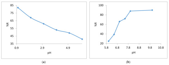 The pH is an important parameter that affects the interactions between the adsorbent and adsorbate and the effect of pH on the adsorbate uptake may be highly, moderately or slightly significant depending on chemical structures of both dyes as it affects the degree of ionization. Figure 7a,b show the effect of pH on adsorption of the selected dyes. The observed behaviours of the selected dyes towards the prepared adsorbent differ from each other, which is not surprising as one dye is negatively charged, while the other is positively charged and the tested pH ranges used were on acidic side for acid red 4, while methylene blue was in the basic form. For acid red the optimum pH for removal was around 1, while for methylene blue it was 8.