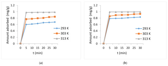 The equilibrium times of AR4 and MB adsorption on the prepared AC are given in Figure 8a,b, respectively, at three different temperatures. The equilibrium was reached in 5 min. for both dyes. Initially, the adsorption sites available were high in numbers and as fast adsorption occurred, number of available adsorption sites decreased to a steady state.