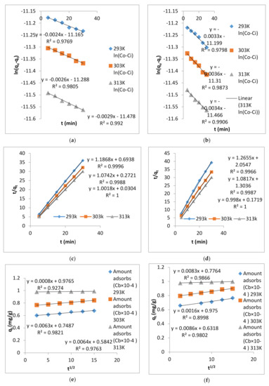 Kinetic models for RA4: (a) pseudo-first-order kinetics model; (c) pseudo-second-order kinetics model; (e) intraparticle diffusion model. For MB (b) pseudo-first-order kinetics model; (d) pseudo-second-order kinetics model; (f) intraparticle diffusion model.
