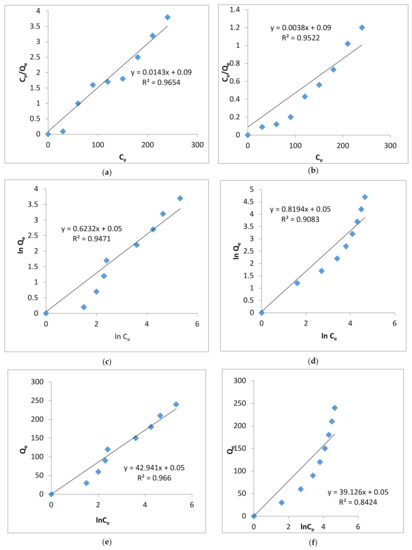 A plot of Ce/qe, versus Ce (from slope and intercept) enabled us to determine the value of KL and Qm (Figure 10a,b) and their values along with the correlation coefficient R2 are given in Table 5. The Langmuir isotherm provided the best correlation coefficient R2 value and hence, the best fit for the experimental data.