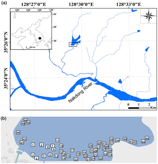 Map of the study area in mid–lower reaches of Nakdong River (a). The sampling sites are represented by rectangles (□). Upper-left inset indicates the Korean Peninsula and study area (●). Fifty quadrats were established based on the different species composition of aquatic macrophytes (b).
