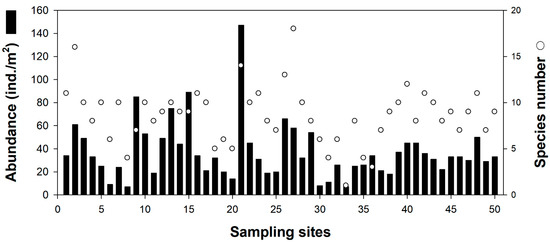 A total of 41 invertebrate species were identified in the 50 quadrats. Radix auricularia was the most common in the study area (relative abundance: 22.5%), followed by Hippeutis cantori (19.1%), Physa acuta (16.7%), and Parafossarulus manchouricus (9.4%). The remaining invertebrate species accounted for <7% of the total abundance. The abundance and species richness of invertebrate communities differed among the 50 quadrats (Figure 2; one-way ANOVA; p < 0.05). The highest number of invertebrate species was found in quadrat 27 (18 species), followed by quadrats 2 (16 species) and 21 (14 species). We found <10 species of invertebrates in 30 quadrats. However, the quadrats with high invertebrate species richness did not match the abundance of invertebrates. Quadrat 21 supported the highest abundance of invertebrates, followed by densities of 78 to 86 ind./m2 at sites 9, 13, and 15.