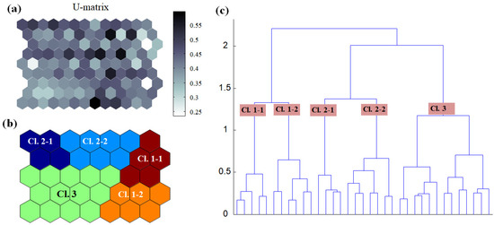 Clustering through data learning by the self-organizing map. (a) U-matrix, (b) clustering result, and (c) hierarchical dendrogram. Cl., cluster. The darker the color of U-matrix (i.e., dark gray to black), the higher the difference between nodes (hexagons).