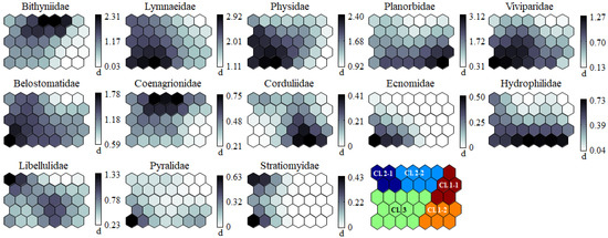 By visually comparing the component planes shown in Figure 4, each invertebrate group exhibited different shapes and gradients on the map plane. A large proportion of gastropods, such as Lymnaeidae, Physidae, and Viviparidae, were concentrated in cluster 3, along with other invertebrates (Belostomatidae, Ecnomidae, and Pyralidae). Bithyniidae and Coenagrionidae were distributed in cluster 2–2, and Planorbidae and Corduliidae were concentrated in cluster 1–2. Hydrophilidae was widely distributed in the lower part of the map. The remaining invertebrate group (i.e., Libellulidae) was dispersed on the map plane.