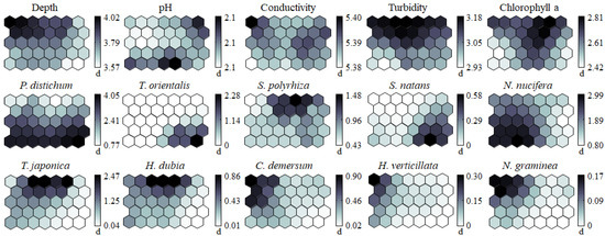 In addition to the 13 invertebrate groups, five environmental variables and eight macrophyte species were displayed on the SOM (Figure 5). Each variable exhibited a different gradient on the planes, and these gradients were helpful for interpreting the influence of environmental variables and macrophytes on the distribution of invertebrate communities. Depth and turbidity were mainly concentrated in clusters 2–1 and 2–2, whereas the remaining environmental variables were irregularly distributed. In contrast to the environmental variables, the biomass of aquatic macrophytes was clearly separated on the map plane. When we masked the biomass data of each macrophyte species over the trained SOM plane, a distinguishable distribution pattern of plant species was observed. P. distichum, T. orientalis, S. natans, and N. nucifera were located in the lower part of the map. T. orientalis and S. natans were distributed in the right lower corner of the map (cluster 1–2), while the sampling sites where N. nucifera was abundant were concentrated in the left lower corner of the map (cluster 3). In contrast, macrophyte species, such as S. polyrhiza, T. japonica, H. dubia, C. demersum, H. verticillata, and N. graminea, belonged to the upper parts of the map. S. polyrhiza, T. japonica, and H. dubia were distributed in the middle of the map (cluster 2–2), while C. demersum, H. verticillata, and N. graminea were in the left upper corner of the map (cluster 2–1). Cluster 1–1 was supported by an open water surface with few aquatic macrophytes.