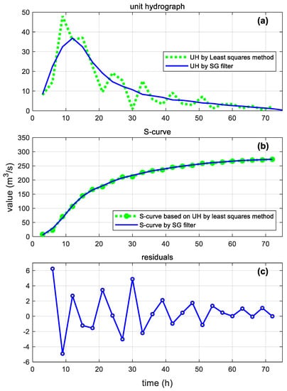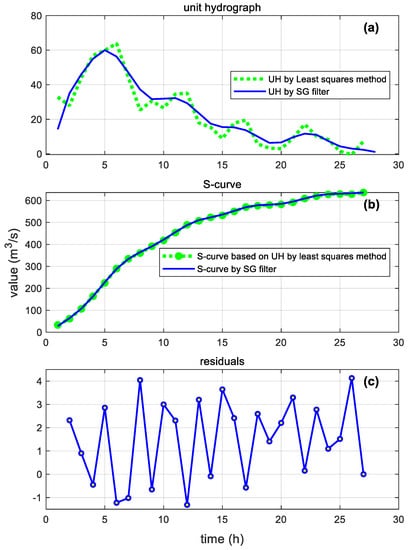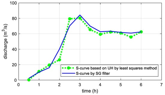 The 3-h conventional S-curve was developed by successively adding a series lagged by duration T = 3 h until the base time (72 h) shown in Figure 4b. The equilibrium discharge was 273 m3 s−1. The S-curve was smoothed and differentiated using the SG filter with parameters . The resulting SG filtered S-curve is compared to the S-curve obtained by a traditional method in Figure 4b. The residual between the above-mentioned two S-curves is shown in Figure 4c. It can be seen that the SG filter provided a remarkable improvement for oscillation. The resulting hydrograph based on the IUH is compared to in Figure 4a. The UH parameters for were determined to be , while those of .
