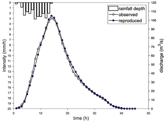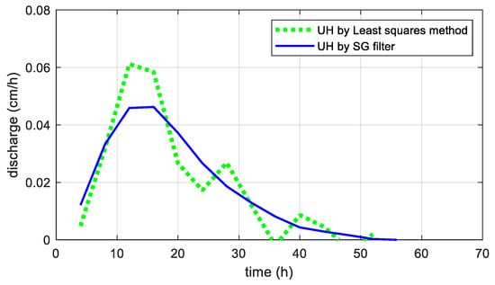 Here, the SG filter parameters were . The resulting hydrograph is compared to in Figure 8. The UH parameters for were determined to be , while for , , where is in h and is in cm h−1. The results of this basin showed no particular difference in UH shape from those of other watersheds. However, in Figure 8, the peak value is somewhat different, though the difference could be reduced by applying different values of SG parameters. The explanation for this is given in the next section.