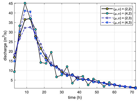 The SG filter can also employ different window sizes and polynomials of different orders to infer better values of weights. A plot comparing the IUHs for four different SG filter parameters with = (2, 2), (2, 3), (4, 2), and (4, 3) is presented in Figure 9. It appears that lower values of rendered the UHs smoother but predicted a lower or later peak. In the case of , there was no remarkable difference between 2 and 3.