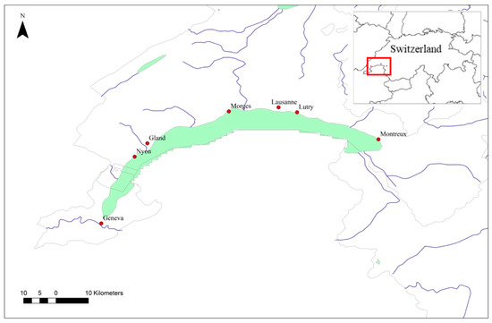 The study was conducted on the Swiss side of Lake Léman (also known as Lake Geneva). Lake Léman is one of Western Europe’s largest lakes at 95 km in length and up to 13 km in width and over 300 m deep. The majority of the lake (345 km2) is under Swiss jurisdiction with the rest (234 km2) under French jurisdiction [25]. Approximately 1.65 million people live in the immediate lake basin (Région Lémanique) as of 2020 (https://ec.europa.eu/eurostat (accessed on 10 March 2021)).