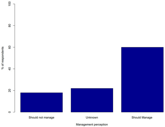 People’s support for management was correlated with their perception of ES or EDS (p < 0.001, df = 6, dev = 27.3). Respondents that perceived that aquatic plants were associated with both the provision of ES and EDS were significantly more likely to report that plants should be managed (p-value < 0.01) than indicate that aquatic plants should not be managed. Conversely, respondents that reported that aquatic plants were only associated with ES provision were significantly more likely to indicate that plants should not be managed (p-value < 0.01), or that they were unsure as to management (p-value < 0.01). There was no significant association between respondents that indicated that aquatic plants only provided EDS or neither ES or EDS and the type of management reported.