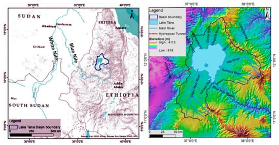 Consumptive uses of the Nile River water had been rapidly increasing over the last century, and demand projection shows a significant increase that may exceed the average annual supplies [1]. Population growth (expected to be double by 2050), urbanization, irrigation expansion (an anticipated increase of 60–70% in the coming decade), extreme poverty and lack of alternative livelihoods, high seasonal flow variability, environmental degradation, low land productivity, and lack of adequate infrastructural management will result in increasing pressure on the limited water resources of the river basin [2]. Furthermore, many studies (e.g., [3,4,5]) showed that several parts of the Nile Basin are sensitive to variations of climatic variables suggesting that climate change will have a significant impact on its water resources. The transboundary nature of the Nile waters reveals the interconnectedness of the Nile states, which rely upon the Nile ecosystem not only for economic, social and cultural needs but also for the maintenance of peace and security in the region [6]. Since recent years, the hegemony of Egypt over the Nile River is changing, and the hydropolitics has entered into a new dynamism [7]. For example, the flow dynamics of the Blue Nile River (contributing about 87% of the Nile River water) will be changed due to the construction of a big dam reservoir, named the Grand Ethiopian Renaissance Dam (GERD) [8]. Through this dam, Ethiopia aims at providing access to electricity for its citizens while also becoming the energy hub in the region and sell cheap energy for the other Eastern Africa countries [2]. The dam is near completion and will be the biggest dam in Africa. Though it is primarily for power generation purposes rather than for consumptive use, its operations will change downstream flow patterns significantly [8]. This dam filling and future operation is the current hot political issue of the region and the hydropolitics of the world. Lake Tana is the source of the upper Blue Nile River which is the major tributary to the Nile River. The Nile Basin is shared by eleven riparian countries and is the lifeline for more than 238 million people living in the basin [9,10].