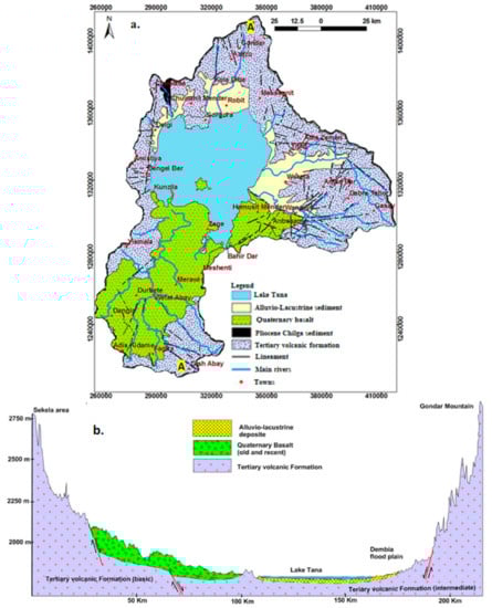 Geological map of Lake Tana Basin (a) and a cross-section from Sekela to Gondar mountain (A–A′) (b) modified after Nigate et al. [41], (2017). The UTM zone is 37P and the coordinate system is WGS 1984.