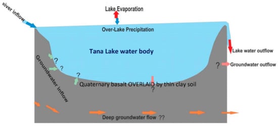 Conceptual diagram depicting possible water balance components at Lake Tana. Uncertainties are indicated by question marks.
