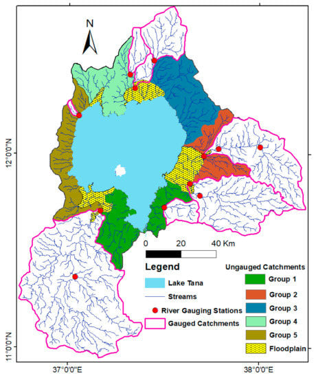 Map of Lake Tana Basin with the location of the floodplain, gauged and ungauged catchments modified after Dessie et al. [12]. According to Dessie et al. [12], runoff from the groups of ungauged catchments was predicted based on calibrated model parameters of observed runoff data from Gelda for Group 1, from Rib for Group 2, from Megech for Group 3, from Dirma for Group 4, and Dirma for Group 5. The selection of hydrological areas to transfer hydrological parameters is based on similarities in hydro-physical characteristics.