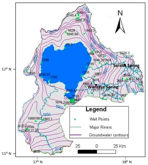 Groundwater head distribution in the Lake Tana Basin modified after Kebede et al. [63,64]. The hydraulic head values of the well points and some the contour are shown. The contour interval is 100 m. They are concentrated on the highlands and relatively far apart in the plain part, showing the high gradient in the highland, and the low in the lowlands.