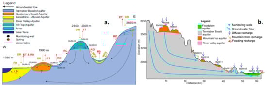 Hydrostratigraphical model for Gumara river catchment (a) (not to scale), and for Rib (b) with the different recharge/discharge mechanisms from the Guna shield mountain chain to the Lake Tana (after Van Landtschoote [64] and Getenet [43]), (DR = diffuse recharge, MFR = Mountain Front Recharge, LR = Leakage recharge, FR = Flooding recharge, LD = Lake discharge, ET = Evapotranspiration, RD = River Discharge, RO = groundwater discharge from springs.