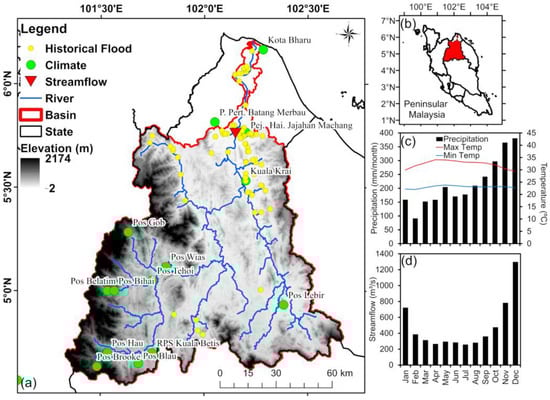 (a) Topography, (b) location, (c) monthly average climate and (d) monthly average streamflow of the Kelantan River Basin, Malaysia.