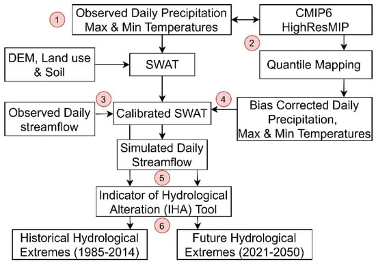 The general framework of this study is shown in Figure 2 and includes the following steps: (1) SWAT input collection, (2) HighResMIP data download and bias correction; (3) SWAT calibration and validation; (4) Incorporation of the bias corrected HighResMIP into calibrated SWAT, (5) calculation of flow extremes based on the IHA indicators, and (6) comparison of the changes between future (2021–2050) and historical (1985–2014) flow extreme.