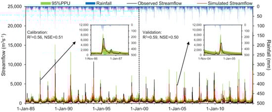 The comparison between the observed and simulated streamflow in the case of Jambatan Guillermard during the calibration (1985–1999) and validation (2000–2014) periods is shown in Figure 3. In general, the simulated monthly and daily variations of streamflow are captured reasonably well with respect to the observed streamflow. However, an overestimation of baseflow is found for the period of 2010–2014, which is possibly due to increasing groundwater demand in recent years [62], as there is no accessible groundwater extraction data for the study area. Six groundwater parameters were considered in the SWAT calibration by allowing more water transfer from baseflow to surface or atmosphere so that the impact of inadequate groundwater data is minimized.