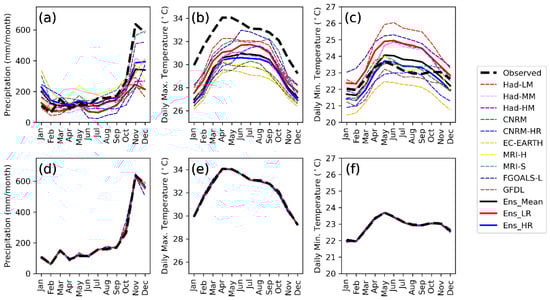 The annual cycles of monthly precipitation amount (a,d), monthly mean daily maximum (b,e) and minimum temperature (c,f) for the ten CMIP6 HighResMIP experiments, compared to the MMD observations during the period 1980~2014: (a–c) original; (d–f) bias-corrected for the Kelantan River Basin, Malaysia.