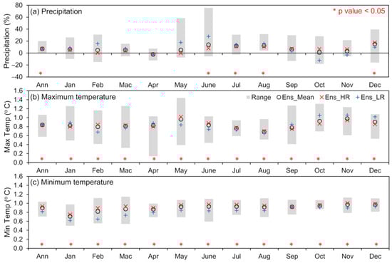 The projected annual and monthly changes in precipitation, daily maximum and minimum temperatures over the KRB for the period 2021–2050 relative to 1985–2014 are shown in Figure 5. Annual precipitation is projected to increase significantly by 6.9%. For almost every month, the precipitation amount is projected to increase from 0.94 (October) to 15.1% (December), except for April with a reduction of 2.4%. In Figure 5a, statistically significant changes in the monthly average precipitation are seen in June, July, August and December, indicating a general increase in precipitation during the SWM and the early phase of the NEM.
