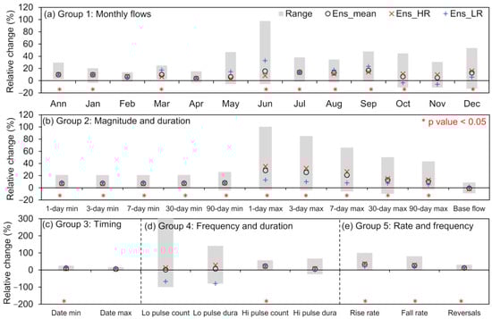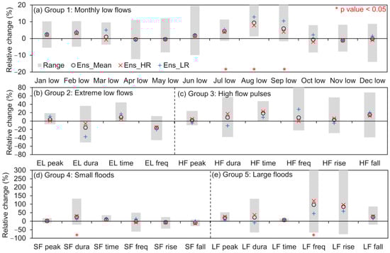 Projected changes in hydrological extremes as indicated by 32 EFC parameters of (a) monthly low flows, (b) extreme low flows, (c) high flow pulses, (d) small floods and (e) large floods between 1985–2014 and 2021–2050 at the Jambatan Guillermard station.