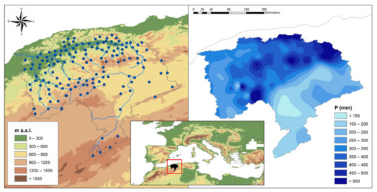 The Mediterranean basin is climatically affected by the interaction between mid-latitude and tropical processes, being located in a transition zone between the arid climate of North Africa and the temperate and rainy climate of Europe. For this reason, it is considered a major hotspot of climate change, subject to strong warming and drying, with increasing consequences on spatial and temporal precipitation distribution [1]. Within this context, spatial and temporal precipitation analyses with different methodologies has been recently performed in the Mediterranean basin [2] and, especially, in Northern Africa [3]. The majority of these studies were principally based on non-parametric tests, which are better suited than parametric ones to deal with non-normally distributed data in hydrometeorology [4]. In particular, different results have been obtained between the eastern and western side of the region. In effect, the west-central part is characterized by a negative rainfall trend [5], albeit irregular and high variable across the decades. By contrast, the eastern side presents positive rainfall tendencies in some areas [6,7], and negative trends in others such as Israel [8,9]. In the Middle East and North Africa (MENA) region, which includes North Africa, Donat et al. [10] detected an opposite behavior in the period 1980–2010: a marked positive trend in the western side, and some consistent tendency toward dryer conditions in the eastern part. In the past years, several studies evidenced a negative rainfall trend in Northwest Africa [11,12]. For example, in the Maghreb region, Tramblay et al. [13] detected a strong negative trend in annual rainfall and number of wet days for the period 1950–2009. This trend behavior was more marked for Morocco and Western Algeria. In particular, in Algeria, average annual rainfall evidenced a decrease beginning around the second half of the 1970s [14]. This tendency has been forecast to continue over the 21st century [15,16] and to be particularly significant in semiarid areas.