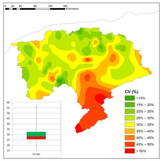 - a spatial gradient in the CV values between the southern and the northern sides of the basin has been identified, with the highest values detected in the mountainous areas of the south side of the region and the northern areas showing the lowest CV values;